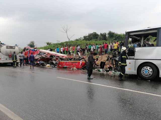கானா நாட்டின் கிழக்கே எனியினம் என்ற பகுதியில் பயணிகளை ஏற்றி செல்லும் இரு பேருந்துகள் சரக்கு லாரி மீது மோதி விபத்திற்குள்ளானது. இந்த விபத்தில் 8 பேர் பலியாகி உள்ளனர். 3 பேர் காயமடைந்து உள்ளனர்.