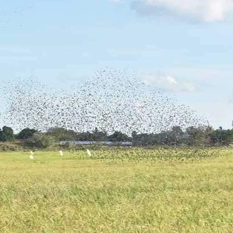 கூட்டம் கூட்டமாக சுமார் 5000 இற்கும் மேற்பட்ட குருவிகள் ஒரே தடவையில் பரவலாக வயல் நிலங்களில் இறங்கி நெல் கதிர்களை துவம்சம் செய்கின்றன.
