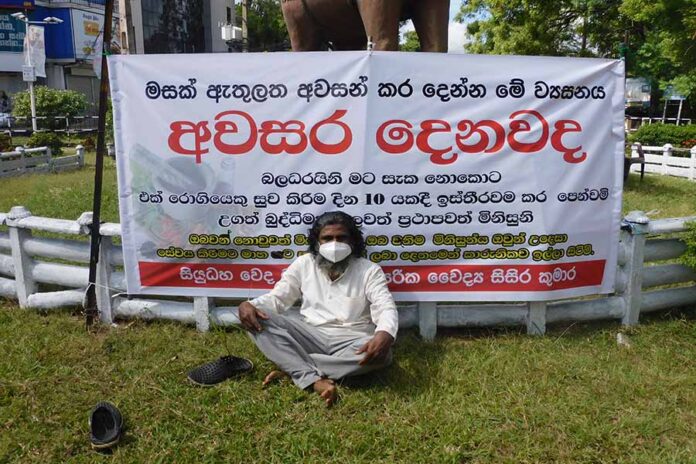 அனுராதபுரம் மருத்துவ மையத்தில் பாரம்பரிய மருத்துவராக செயற்பட்டு வரும் ஹேவாகமகே நிஹால் சிசிர குமார (55) என்பவரே இந்தப் போராட்டத்தில் ஈடுபட்டுள்ளார்.
