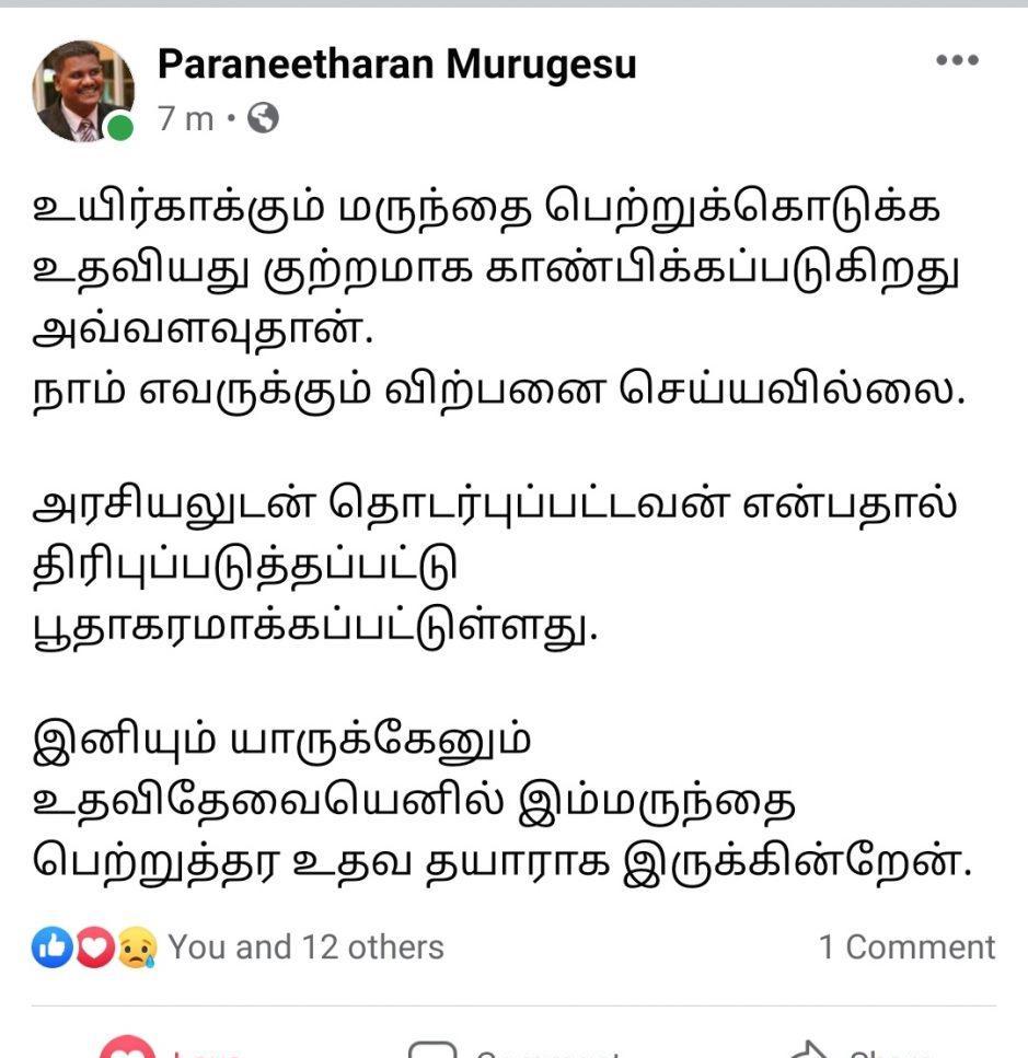 இதேவேளை, குறித்த மருந்து வகையை இந்தியாவிலிருந்து கொண்டு வந்து தர முடியும் என  அரசியல்வாதியான M.பரணிதரன் தனது பேஸ்புக் பக்கத்தில் பதிவொன்றை பதிவிட்டுள்ளார்.